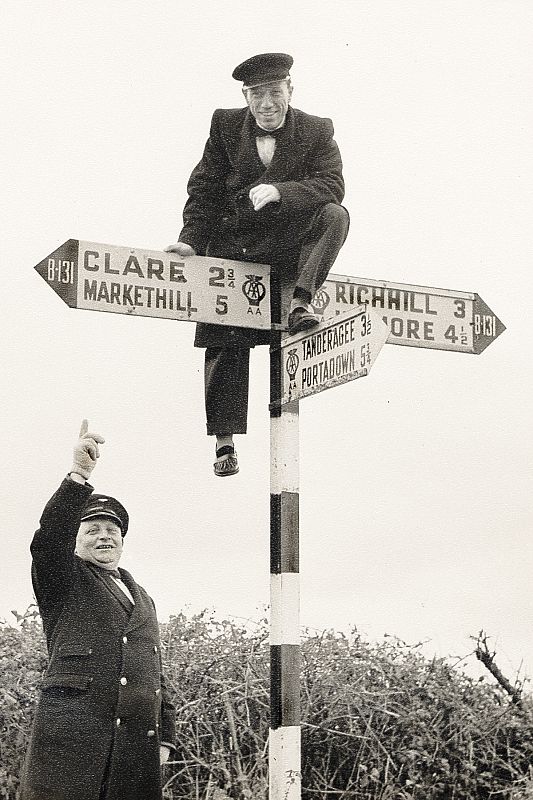 Carson Brownlee directing Billy Gracey where to go! For many years the pair were wedding chauffeurs for Montgomery''s limousines and made a great double act. The photo was taken early 1960''s at Ahorey whilst a bride and groom were being hitched in the church there.