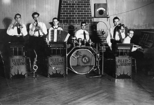 The members of the band were J. Higginson Trumpet. B. Hamilton Clarinet and Alto Saxophone. T. Gallery Accordion. Ralph McNally Vocals and Drums. Billy Gallery Violin. Harry McCusker Piano. Please refer to the article by Ellen Roney where she mentions the band. Note the beautiful maple floor which was nearly destroyed when roller skating was allowed for a short time.