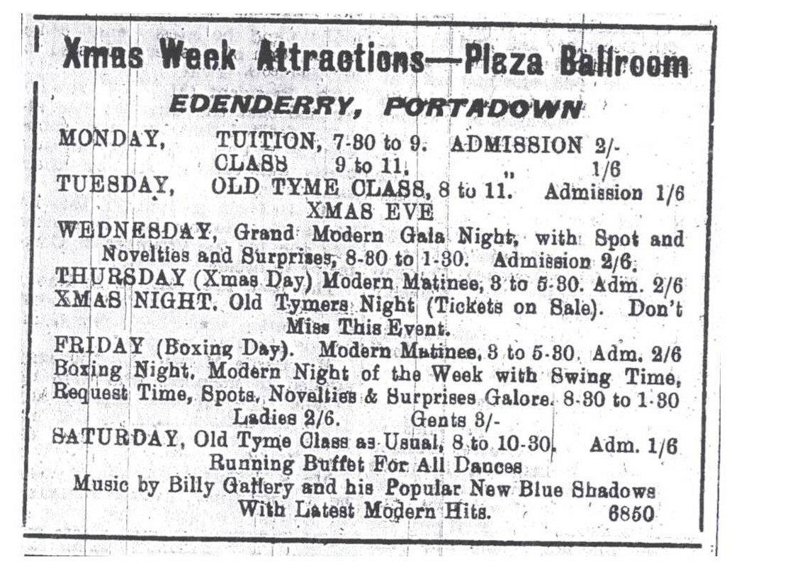 As you leave Portadown passing over the bridge en-route to Lurgan, you drive past the Plaza Ballroom probably without a second glance or thought. Before the age of television or Strictly Come Dancing this building was the dance Mecca for the people of Edenderry, a place, where they met to enjoy a night of dancing, share news, and discuss forthcoming events. Boys met girls, wives found future husbands and many lifelong friendships were made in the Plaza. Monday night was dedicated to ballroom dancing classes, for those who did not know their left foot from their right foot and this unenviable task fell to Mr. and Mrs. George Bothwell, old time and sequence dancing was left in the capable hands of Jack and Mrs Millen and like the ballroom, was enjoyed by all. At that time the building was owned by Mosey Ellis who also had the Pub next door but for 10 years Mr and Mrs William Gallery had the lease of the dance hall. Music was played by Billy’s Band “The Blue Shadows” The shirts for the band were made by Mrs Gallery. And at that time the band consisted of Billy Gallery, Violin, T. Gallery, Accordion. Ralph McNally and Eric Cassidy, Vocals and Drums. Harry McCusker, Piano. J. Higginson, Trumpet. B. Hamilton, Clarinet and Alto Saxophone. A number of those who attended the classes progressed to win Trophies in the Belfast Plaza. For a short period of time roller skating was held, but it had to be stopped as the roller skates damaged the floor and it was the best in the district. A Café was also opened, and a young Adeline Gallery served lunches to employees from Wades, Robb’s or any other hungry worker. The drinks, all soft minerals, were supplied by local firm, Express Mineral Water. In the evenings Adeline, and her sisters, Jean and Josie were in charge of the cloak room. During World War II the venue was requisitioned by the Army, who were stationed in Watson Street, the factory which later became Wade’s Pottery. The Government continued to use the hall for a short time as a Food Office for the Ministry of Food where orange juice, baby food, Robeline, etc. were distributed. The Smith family from Belfast opened Edenderry’s first Fish and Chip shop. and for a few years this was a very popular meeting place, for every one in the area, many of the members of Seagoe Church Lads Brigade and Band affectionately called her “Ma Smith” for on the nights, that the Gym team or the band were home late, she would stay open, so that her boys could have their usual fare!! For a short time, the building was used for a church. From 1968 to 1985 Mr D. McClure had a very successful Upholstery Business, in what was the old ballroom, with part of the ground floor occupied by a cobbler Herbie Killops, after he retired, Ivan Abraham, moved into the shop where he made everyone very welcome, even if you had no shoes to be mended, he was ready for a chat or listen and give comfort or advice. The building is now McNabb’s Funeral Parlour My thanks to Mrs Merle Edgar for her valuable assistance with my research Ellen A Roney.