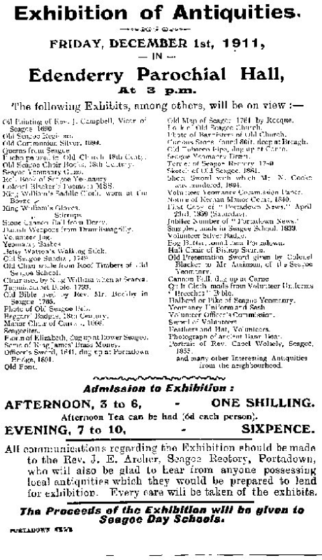 The Exhibition was held in the Parocial hall on Friday, December 1st,1911. The proceeds of the Exhibition went to Seagoe Day Schools.