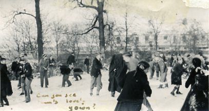 This photo was taken about 1948 in a snow covered play ground in Portadown College, Edenderry. Note one of the teachers mingling with the pupils in his robes.