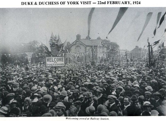 Welcoming crowds at railway Station. Note Station Master's House in background.