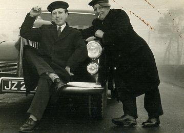 The photo shows Billy Gracey & Carson Brownlee enjoying work as taxi men. This photo is dated 6/2/1960.